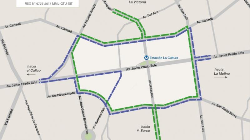 El tránsito en la avenida Aviación se desviará en ambos sentidos, entre las avenidas San Borja Norte y Canadá; a su vez, el tránsito de la vía auxiliar de la avenida Javier Prado será desviado en ambos sentidos, entre las avenidas José Gálvez Barrenechea, Del Parque Norte, Guardia Civil, San Luis y Canadá.