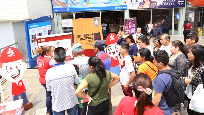 Como parte de la campaña informativa que impulsa con motivo del referéndum del 9 de diciembre, el Jurado Nacional de Elecciones (JNE) brindó hoy información sobre este proceso electoral a los ciudadanos que visitaron el centro comercial Plaza Norte, ubicado en el distrito de Independencia.