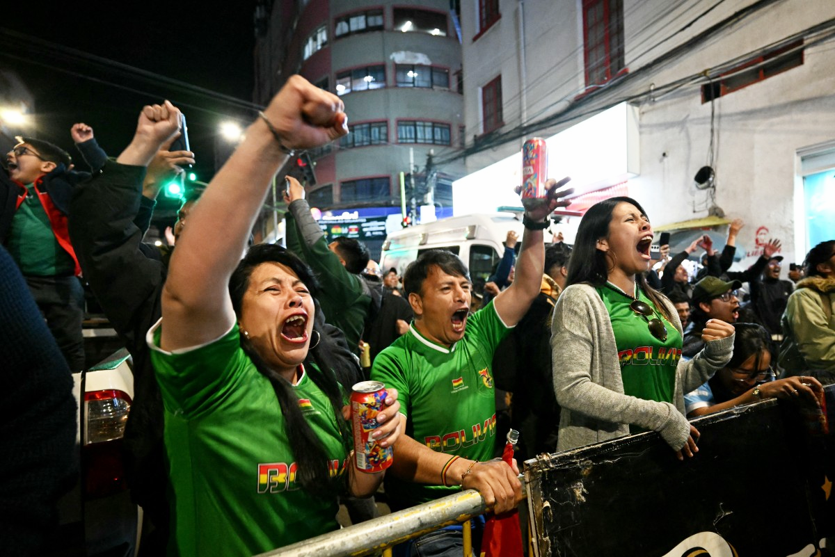 Aficionados bolivianos celebran un gol de su selección contra Surinam en el partido de semifinales de la repesca de las eliminatorias para la Copa Mundial de la FIFA 2026. Foto: AFP.