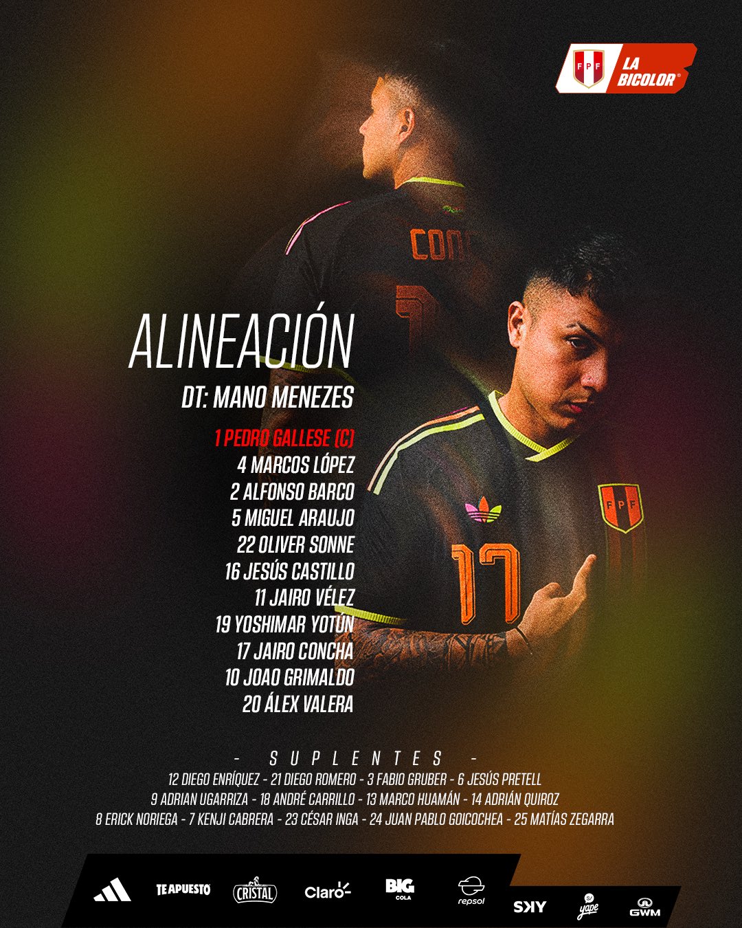 La Blanquirroja saltará al campo con Pedro Gallese, Marcos López, Alfonso Barco, Miguel Araujo, Oliver Sonne, Jesús Castillo, Jairo Vélez, Yoshimar Yotún, Jairo Concha, Joao Grimaldo y Álex Valera.