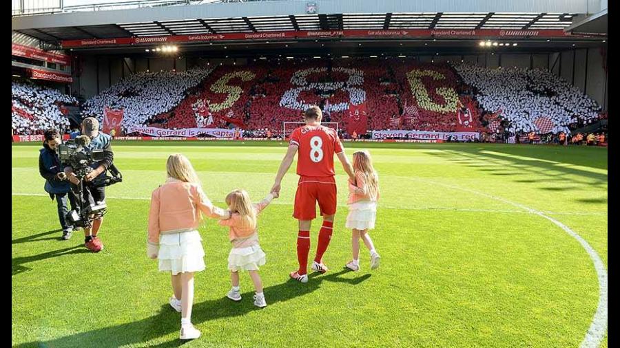 Gerrard ingresó al campo de juego acompañado de sus hijas Lourdes, Lexie y Lilly-Ella, mientras los aficionados lo ovacionaban de pie.