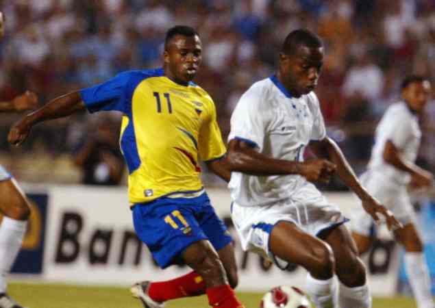 Christian Lara (izq.) de Ecuador disputa el balón con Maynor Figueroa (der.) de Honduras, en 2007.Foto: AFP