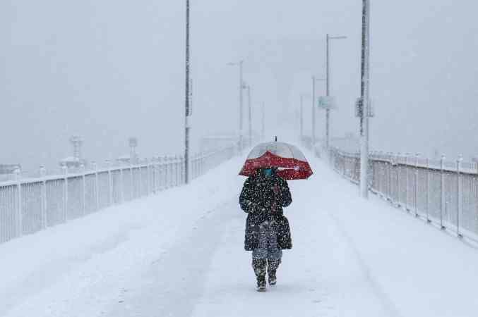 Una persona cruza el puente de Brooklyn durante una tormenta invernal en la ciudad de Nueva York el 23 de febrero de 2026: Foto: AFP.
