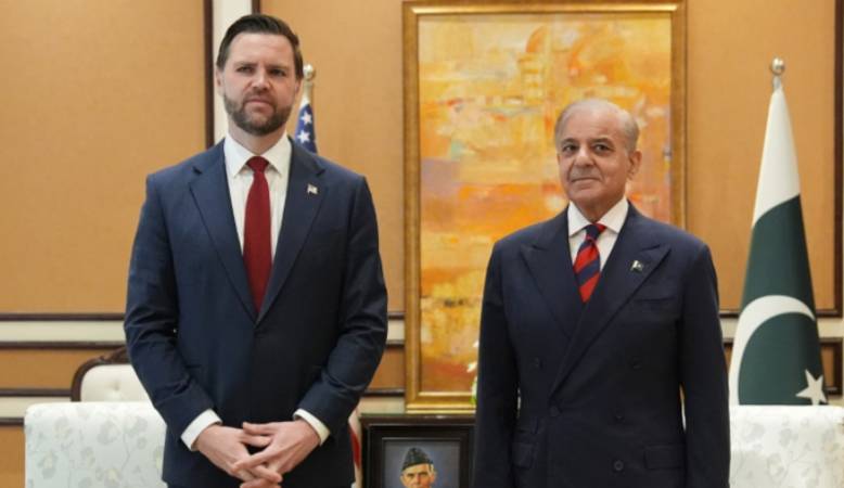 El primer ministro de Pakistán, Shehbaz Sharif (derecha), posa junto al vicepresidente de Estados Unidos, JD Vance, Foto: AFP
