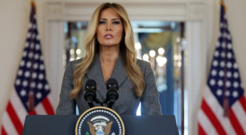 La primera dama de Estados Unidos, Melania Trump, pronuncia un discurso en el vestíbulo principal de la Casa Blanca. Foto: AFP.