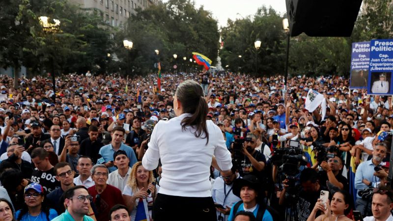 La lideresa opositora venezolana María Corina Machado pidió este jueves a sus compatriotas exiliados en Chile que regresen a Venezuela, durante un acto frente a miles de seguidores organizado en una plaza del centro de Santiago.