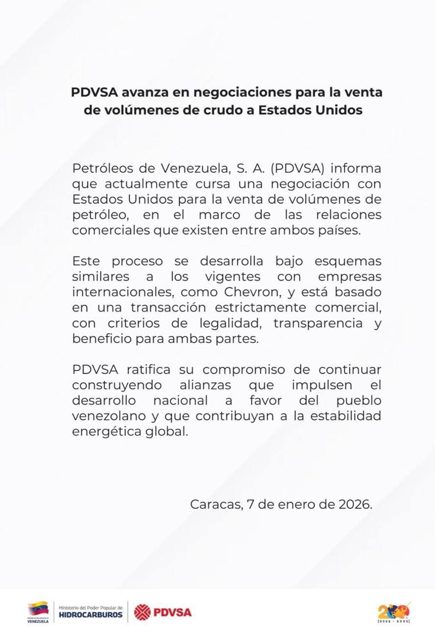 En un comunicado, la estatal petrolera venezolana precisó que las conversaciones se desarrollan “bajo esquemas similares a los vigentes con empresas internacionales, como Chevron”, y subrayó que se trata de una operación de carácter estrictamente comercial, sustentada en criterios de legalidad, transparencia y beneficio mutuo.