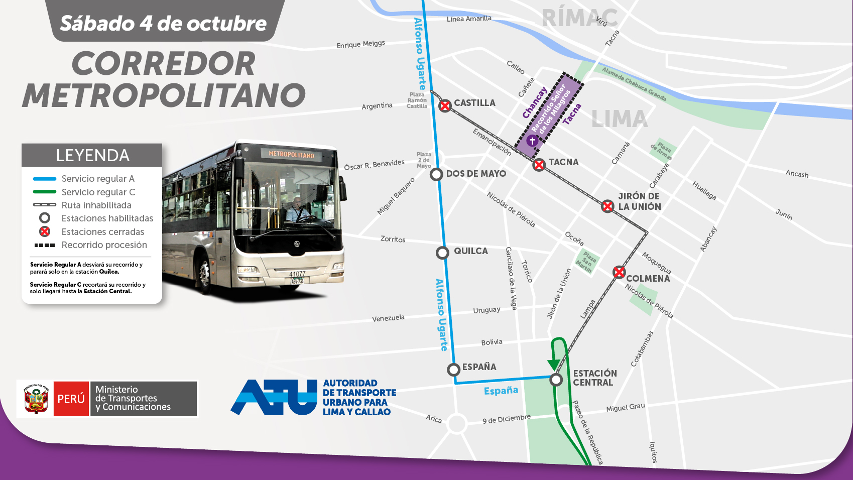 El servicio regular A del Metropolitano circulará por la avenida Alfonso Ugarte, en ambos sentidos, y tendrá como paradas las estaciones Dos de Mayo, Quilca y España, mientras que el servicio regular C solo llegará hasta la estación Central. En el caso de las estaciones Colmena, Jirón de la Unión, Tacna y Castilla, permanecerán cerradas hasta que culmine la procesión.