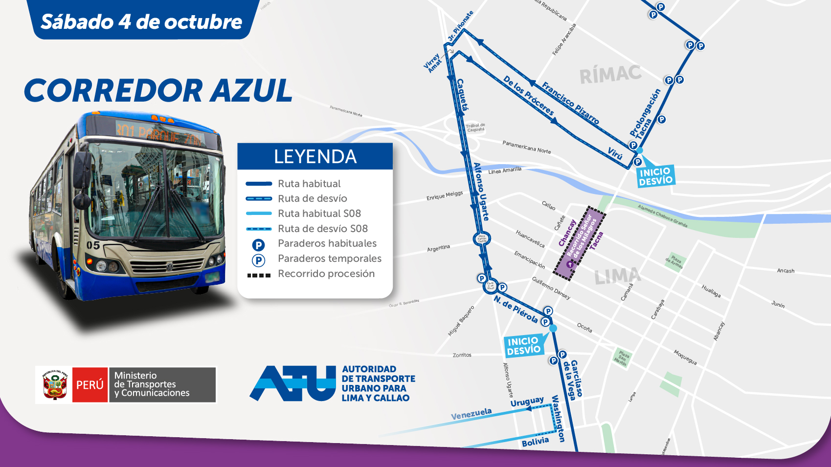 La Autoridad de Transporte Urbano para Lima y Callao (ATU) informó las rutas del Metropolitano, corredores Azul y Morado, y del transporte público convencional que regirán este sábado 4 de octubre desde el mediodía en el Centro de Lima, durante el primer recorrido procesional del Señor de los Milagros.