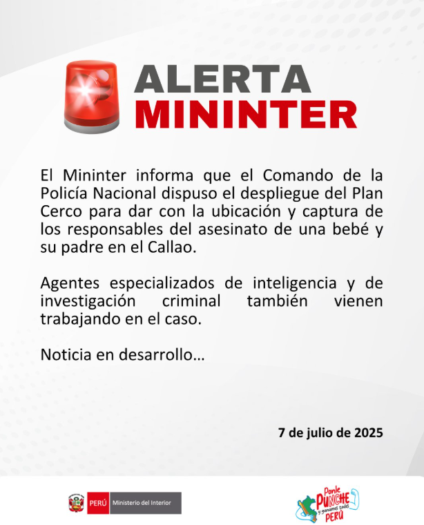 Mediante un comunicado, el Ministerio del Interior (Mininter) informó que el Comando de la Policía Nacional dispuso el despliegue del Plan Cerco para dar con la ubicación y captura de los responsables del asesinato de una bebé y su padre en el Callao.