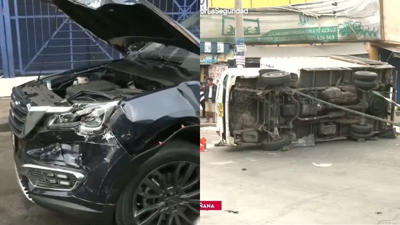 Un accidente de tránsito se registró en la cuadra ocho de la avenida Argentina, en el cruce con el jirón Rodolfo Beltrán, en una zona conocida como Cárcamo en el Cercado de Lima. El hecho involucró a una furgoneta que trasladaba sacos de harina de trigo y a una camioneta particular de color azul. Como consecuencia del impacto, el vehículo de carga pesada terminó volcado hacia un costado de la vía.