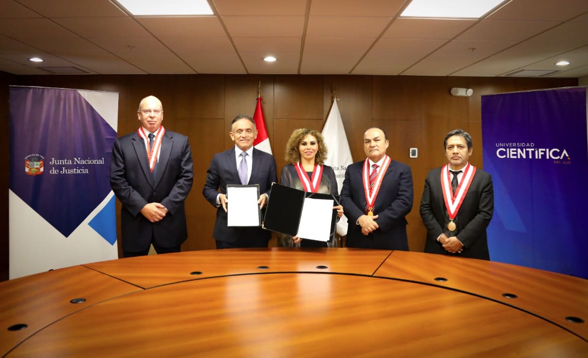 La Junta Nacional de Justicia (JNJ) y la Universidad Científica del Sur (UCS) suscribieron un convenio de cooperación interinstitucional con el objetivo de fortalecer la formación académica y el desarrollo profesional de sus integrantes, en beneficio del sistema de justicia y de la ciudadanía.