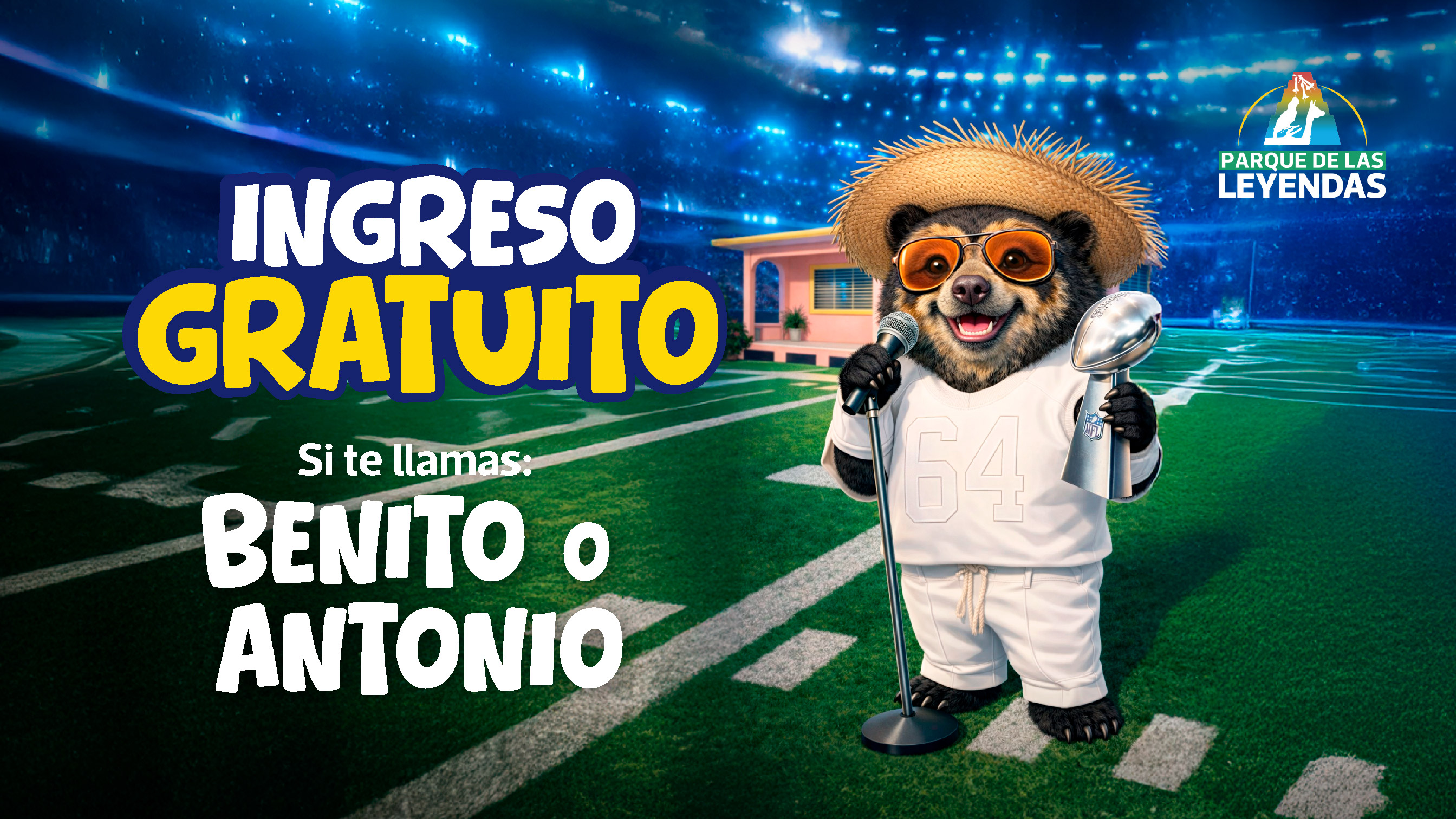 La promoción será válida este 14 y 15 de febrero del 2026 y se aplicará a los primeros 100 visitantes por día (niños o adultos) que acrediten con su documento de identidad llamarse Benito o Antonio. Este beneficio aplicará en ambas sedes del Parque de las Leyendas: San Miguel y Huachipa.