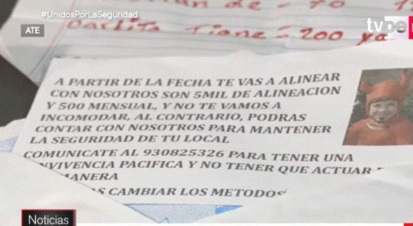 El general Manuel Lozada, jefe de la Dirección de Investigación Criminal, indicó que los detenidos remitían notas extorsivas a sus víctimas bajo amenaza con arma de fuego. En una de las cartas se leía: “Son S/5000 de alineación y S/500 mensual y no te vamos a incomodar”.