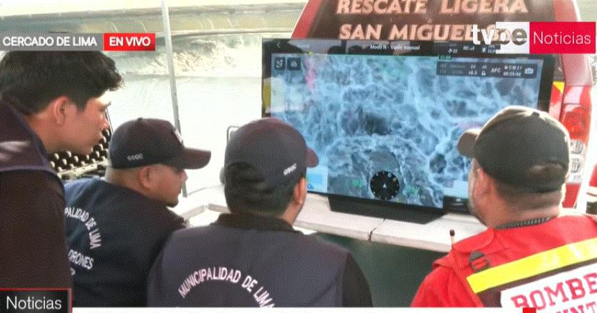 En el operativo participan integrantes del Cuerpo General de Bomberos y de la unidad de rescate de la Policía Nacional, con seis drones de las municipalidades de Lima y San Juan de Lurigancho, además de una grúa y vehículos de emergencia.