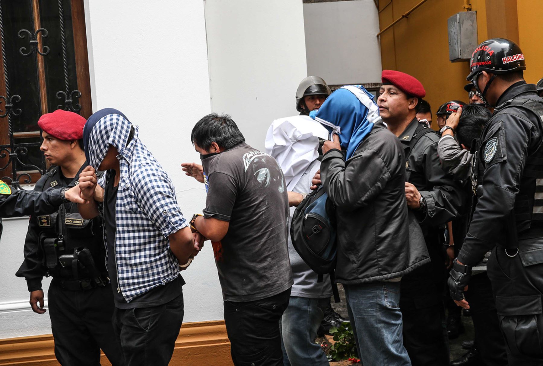 La Policía Nacional trasladó esta mañana a la sede del Ministerio Público, en el Cercado de Lima, a 36 detenidos que tomaron un hostal de la cuadra 4 de la avenida 28 de Julio, en Miraflores.