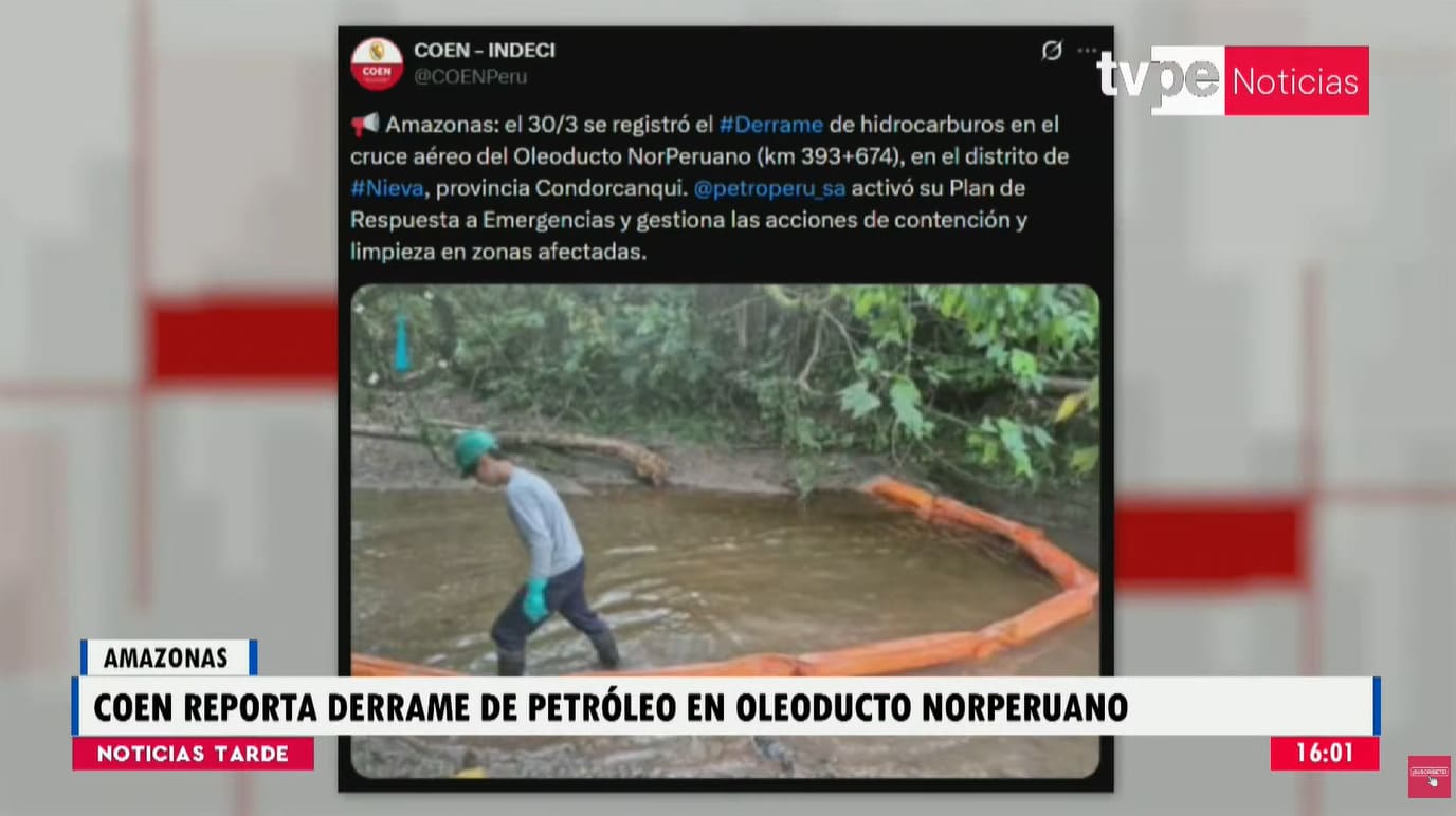 El Centro de Operaciones de Emergencia Nacional (COEN) reportó un derrame de hidrocarburos a la altura del kilómetro 393+674 del Oleoducto Norperuano, en el distrito de Santa María de Nieva, provincia de Condorcanqui, región Amazonas.
