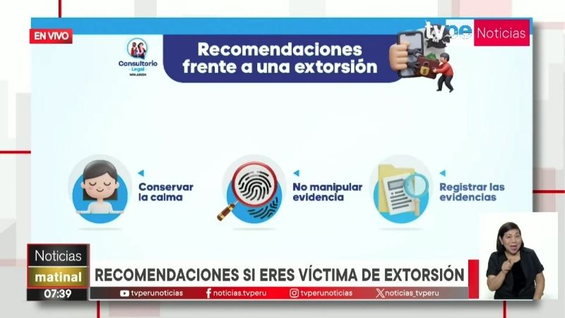 La extorsión se ha convertido en uno de los delitos que más preocupación genera entre comerciantes, transportistas y pequeños empresarios. Frente a este escenario, el supervisor del Servicio de Defensa de Víctimas del Ministerio de Justicia y Derechos Humanos (MINJUSDH), Hernán Neyra Castro, participó en el Consultorio legal para explicar cuáles son los pasos que debe seguir una persona afectada y qué herramientas ofrece la Defensa Pública, servicio que es gratuito y está dirigido, principalmente, a ciudadanos en situación de vulnerabilidad.