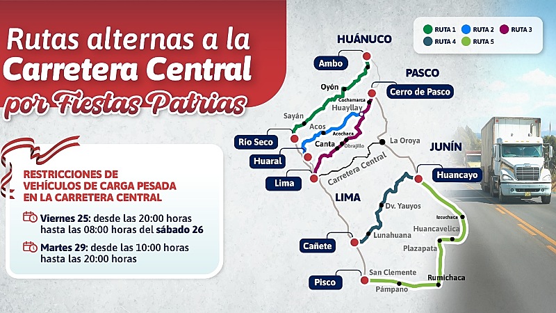 El Ministerio de Transportes y Comunicaciones (MTC) estableció medida de restricción para la circulación de vehículos de carga en la Carretera Central con ocasión de los feriados por Fiestas Patrias del 2025, mediante Resolución Directoral N° 006-2025-MTC/18.
