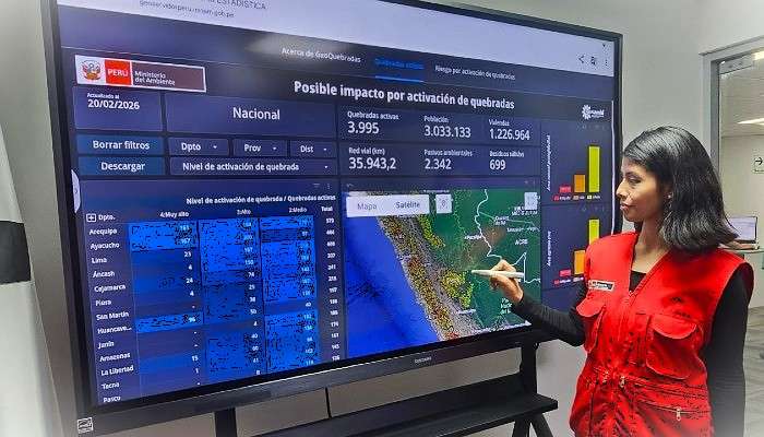 “Geoquebradas” integra información técnica proveniente del Servicio Nacional de Meteorología e Hidrología del Perú (Senamhi), el Organismo de Evaluación y Fiscalización Ambiental (OEFA), el Servicio Nacional de Áreas Naturales Protegidas por el Estado (Sernanp), la Autoridad Nacional del Agua (ANA), el Instituto Nacional de Estadística e Informática (INEI), el Ministerio de Salud (Minsa), el Ministerio de Educación (Minedu) y el Ministerio de Transportes y Comunicaciones (MTC), lo que permite estimar niveles de riesgo sobre población, infraestructura, áreas agrícolas y pasivos ambientales.