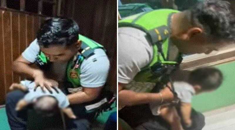 Efectivo policial auxilia a un bebé que se estaba asfixiando. Foto: TVPerú Noticias.