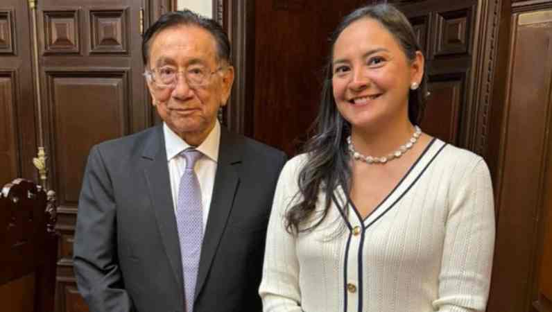 El presidente de la república, José María Balcázar, y la jefa institucional del IRTP, Cinthia Ramírez Santillana. Foto: difusión.