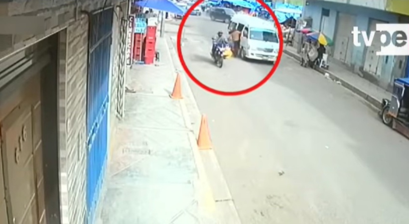Cámaras de seguridad registraron el momento que madre e hija caen de combi en movimiento, en Juliaca. Foto: TVPerú Noticias.