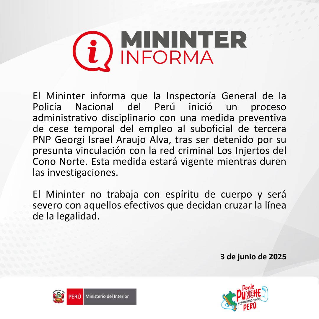 El Ministerio del Interior (Mininter) informó que la Inspectoría General de la Policía Nacional del Perú (PNP) inició un proceso disciplinario con medida preventiva de cese temporal contra el suboficial Georgi Israel Araujo Alva, quien estaría vinculado a la red criminal liderada por el Monstruo, Los Injertos del Cono Norte.