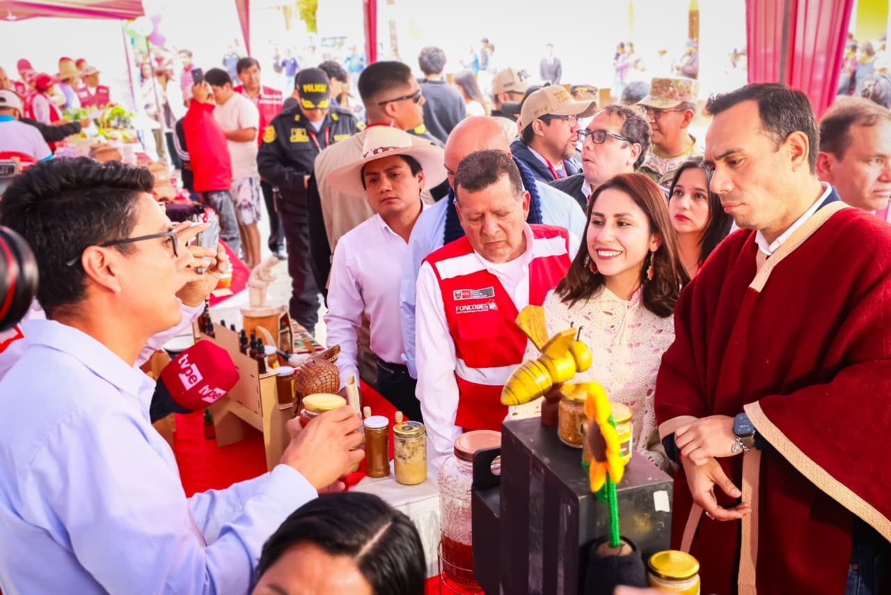Presidente Jerí y ministra Shica recorren feria multisectorial en Jesús para acercar servicios a población vulnerable. Foto: Midis.