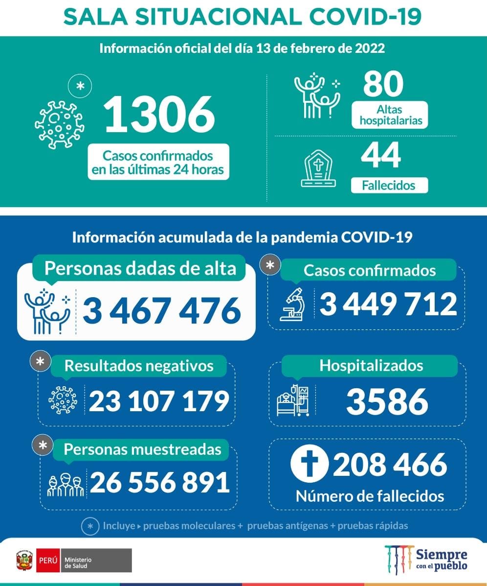 “Durante el 13 de febrero se registraron los resultados de 33 497 personas muestreadas, de los cuales 1306 fueron casos sintomáticos confirmados de ese día. Se registraron parcialmente, además, los resultados de 4032 casos confirmados por COVID-19 de los siete días anteriores”, precisa el comunicado.