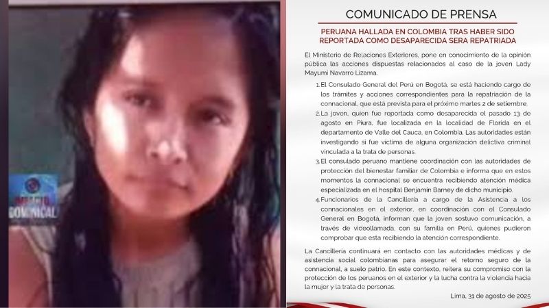 El Ministerio de Relaciones Exteriores (Cancillería) comunicó que el Consulado General del Perú en Bogotá asumió los trámites necesarios para el retorno de la ciudadana Lady Mayumi Navarro Lizama, quien había sido reportada como desaparecida el pasado 13 de agosto en la región Piura.