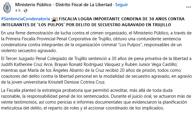El Poder Judicial (PJ) condenó a pena privativa de la libertad a cuatro miembros de la organización criminal Los Pulpos, responsables de un violento secuestro agravado en perjuicio de una estudiante universitaria de Trujillo en el año 2024.