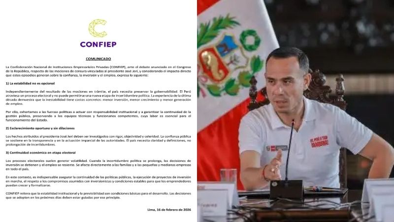 “Confiep reitera que la estabilidad institucional y la previsibilidad son condiciones básicas para el desarrollo. Las decisiones que se adopten en los próximos días deben estar guiadas por ese principio”, finaliza el comunicado.