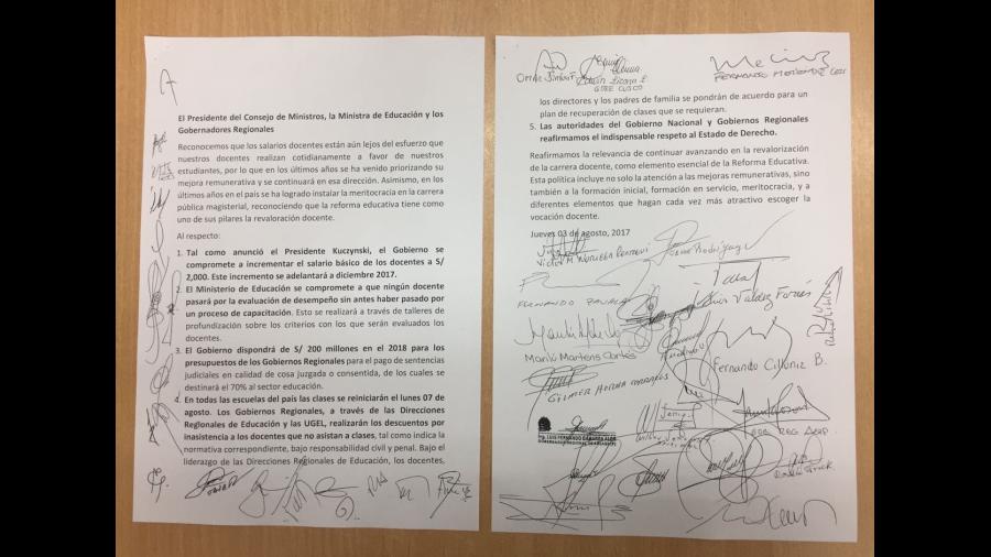 El presidente del Consejo de Ministros, Fernando Zavala, la ministra de Educación, Marilú Martens, y diversos gobernadores regionales anunciaron que el salario básico de los docentes se incrementará a S/ 2,000 en diciembre de 2017, y ya no en 2018 como se tenía previsto.