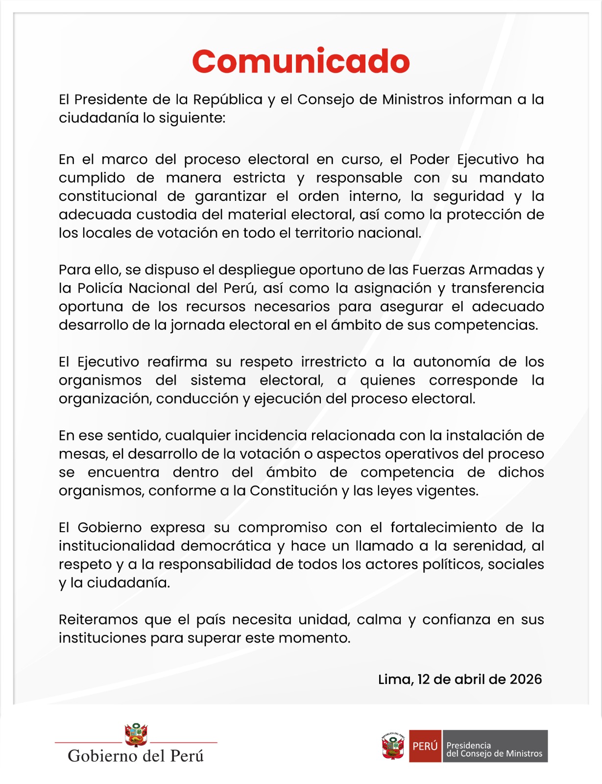 El Poder Ejecutivo emitió un comunicado oficial en el que informa sobre las acciones adoptadas en el marco del proceso electoral. El pronunciamiento fue suscrito por el Presidente de la República y el Consejo de Ministros, quienes señalaron que se ha cumplido con el mandato constitucional vinculado a la seguridad y al orden interno en todo el territorio nacional.