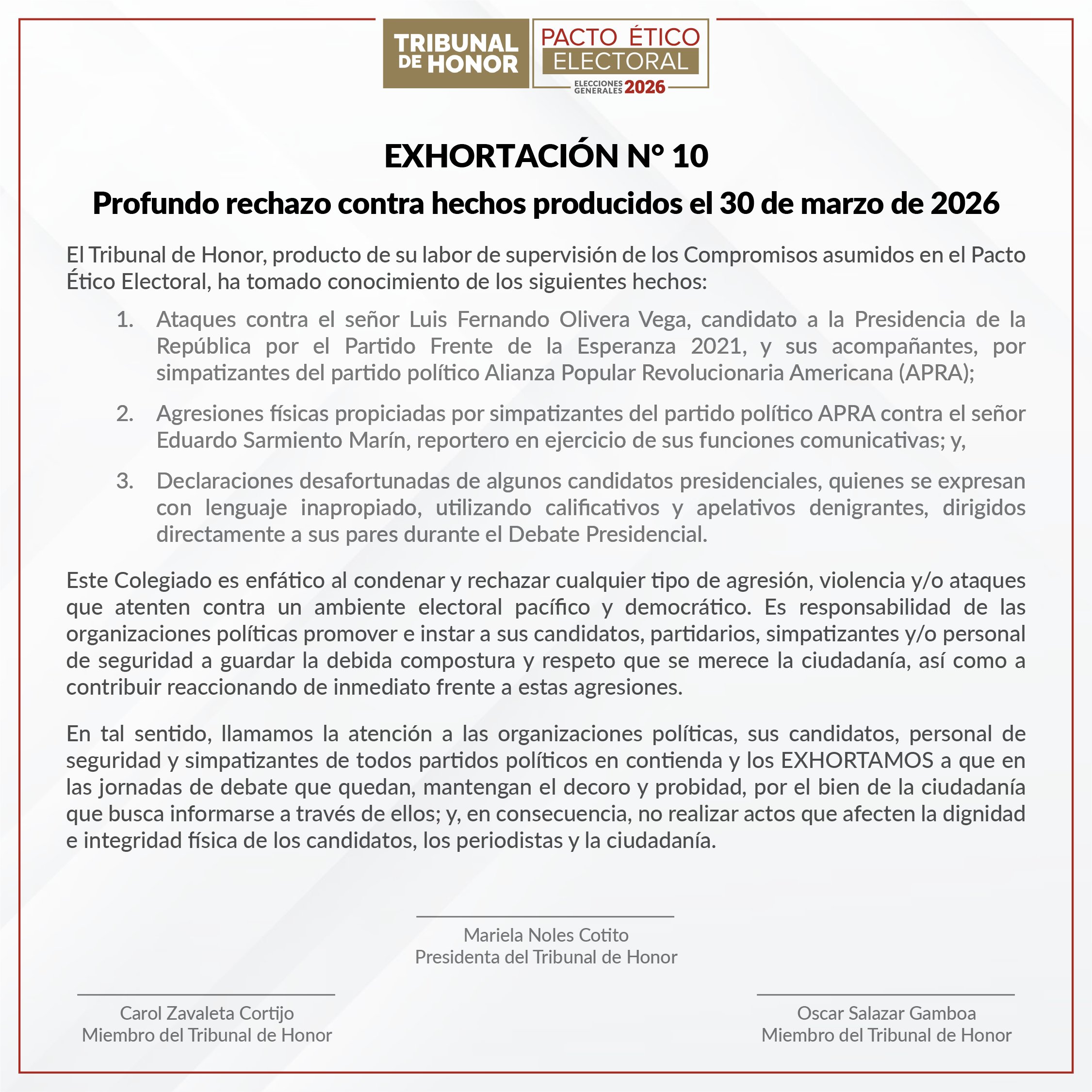 El Tribunal de Honor del Pacto Ético Electoral condenó los incidentes de la última jornada del debate presidencial, marcada por ataques violentos, agravios y declaraciones desafortunadas.