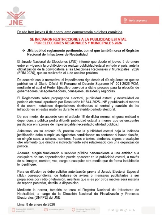 El Jurado Nacional de Elecciones (JNE) informó que desde hoy, 8 de enero, entró en vigencia la prohibición de realizar publicidad estatal en todo el país, ante la oficialización de la convocatoria a las Elecciones Regionales y Municipales 2026 (ERM 2026), que se realizarán el próximo 4 de octubre.