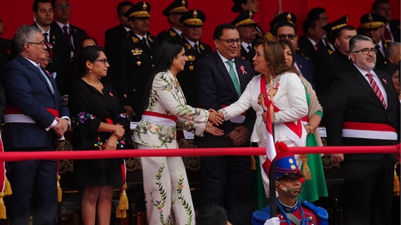 Durante el tradicional desfile en honor a las Fuerzas Armadas y la Policía Nacional del Perú (PNP), la ministra León acompañó a otros miembros del gabinete ministerial y a diversas autoridades en la tribuna oficial.