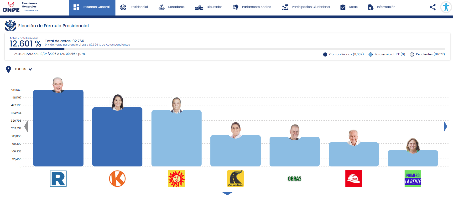 Hasta las 9:21 p. m., con el 12.601 % de votos procesados, estos son los resultados: