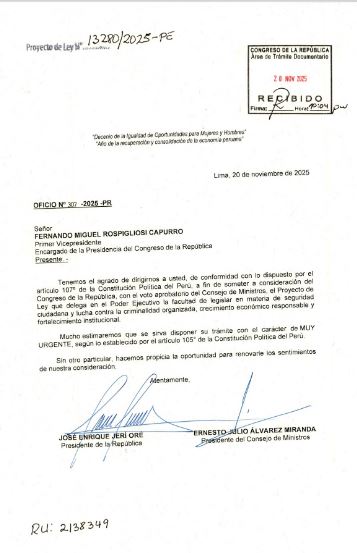 Cabe remarcar que el presidente José Jerí anticipó —semanas atrás— su solicitud por facultades legislativas a fin de emitir normas en temas de seguridad ciudadana. "Redoblaremos nuestros esfuerzos para enfrentar y mitigar las acciones de extorsionadores, sicarios y todo aquel delincuente que intente alterar la tranquilidad de nuestra población”, declaró en octubre pasado.