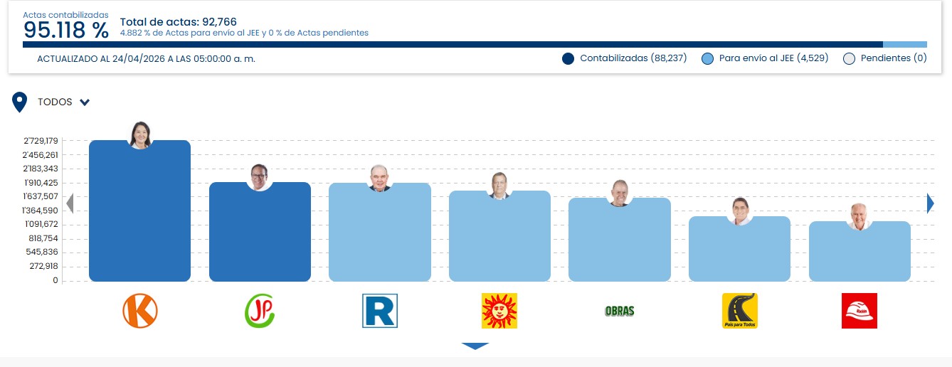 Hasta la 6:30 a. m.., del viernes 24 de abril, con el 95.118 % de votos procesados, estos son los resultados: