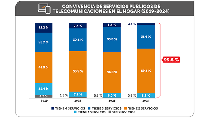El resultado marca una mejora de 3.7 puntos porcentuales en comparación con 2019, año en el que el 95.8 % de hogares tenía acceso a uno o más de estos servicios.