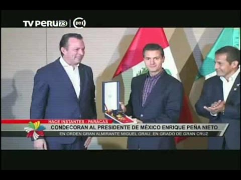 El mandatario de México, Enrique Peña Nieto, fue condecorado esta tarde por el Gobierno peruano con la Orden Militar Francisco Bolognesi en grado de Gran Cruz y la Orden de Gran Almirante Miguel Grau.