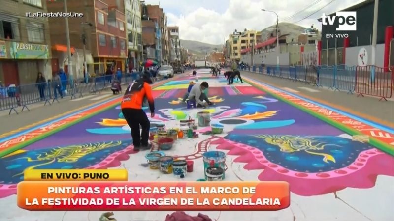 Uno de los espacios que ya concentra miradas es la avenida Simón Bolívar. En varias cuadras, artistas locales y visitantes plasman enormes murales en el piso, con escenas inspiradas en las danzas y símbolos de la festividad. El corresponsal Víctor Apaza explicó que los trabajos comenzaron el lunes y deben concluir antes del inicio de la parada de veneración, que se realiza el lunes y martes.