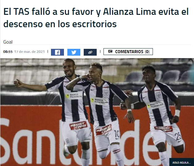 La Tercera de Chile indica que el TAS "devuelve" a Alianza Lima a la Primera División peruana. Mientras que el portal Goal.com asegura que tras el fallo del ente, los íntimos "evitan el descenso en los escritorios".