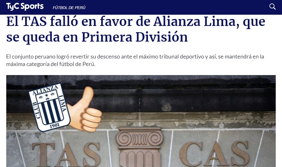 El diario "Olé" de Argentina titula "Alianza Lima se salvó del descenso por escritorio". En tanto TyC Sports señala que el TAS falló en favor de los victorianos y "se queda en Primera División".