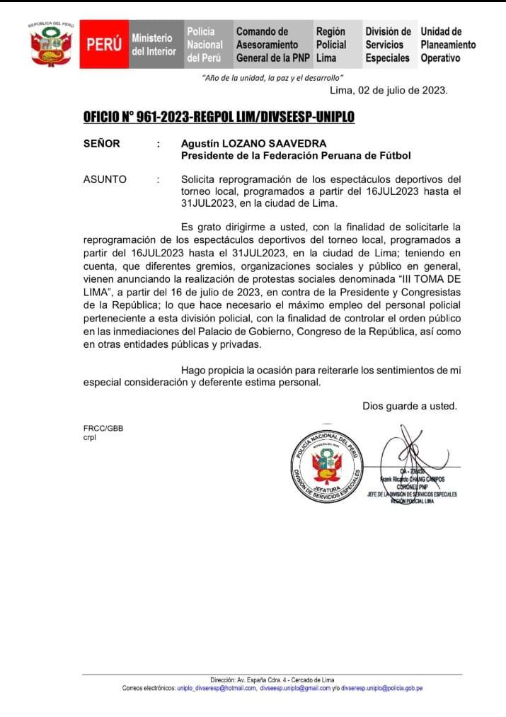 "Es grato dirigirme a usted, con la finalidad de solicitarle la reprogramación de los espectáculos deportivos del torneo local, programados a partir del 16 de julio hasta el 31 de julio, en la ciudad de Lima”, se lee en la primera parte del oficio.