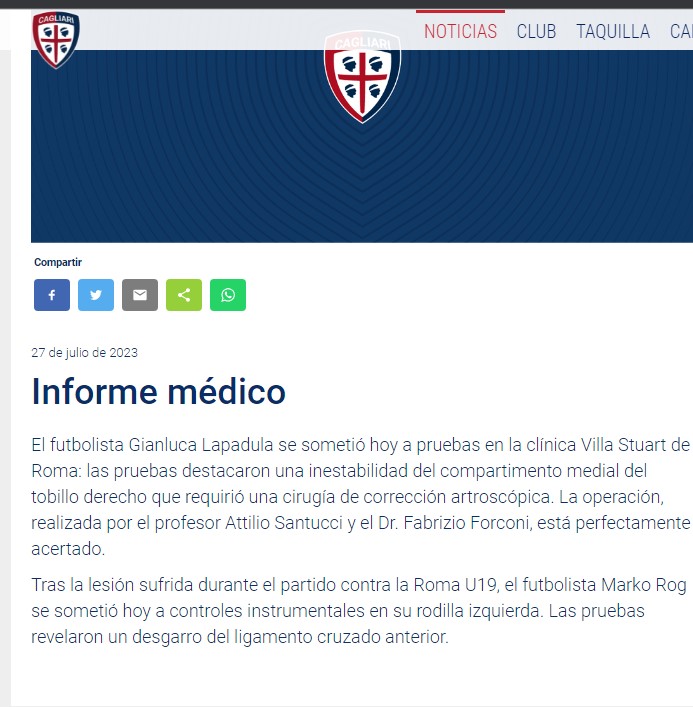 "El futbolista Gianluca Lapadula se sometió hoy a pruebas en la clínica Villa Stuart de Roma: las pruebas destacaron una inestabilidad del compartimento medial del tobillo derecho que requirió una cirugía de corrección artroscópica. La operación, realizada por el profesor Attilio Santucci y el Dr. Fabrizio Forconi, está perfectamente acertado", indica el informe médico publicado por el Cagliari, de la Serie A de Italia.