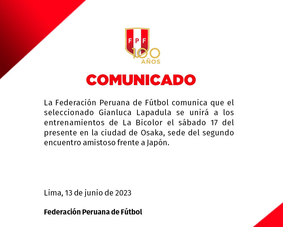"La Federación Peruana de Fútbol comunica que el seleccionado Gianluca Lapadula se unirá a los entrenamientos de La Bicolor el sábado 17 del presente en la ciudad de Osaka, sede del segundo encuentro amistoso frente a Japón", informó la FPF en sus redes sociales.