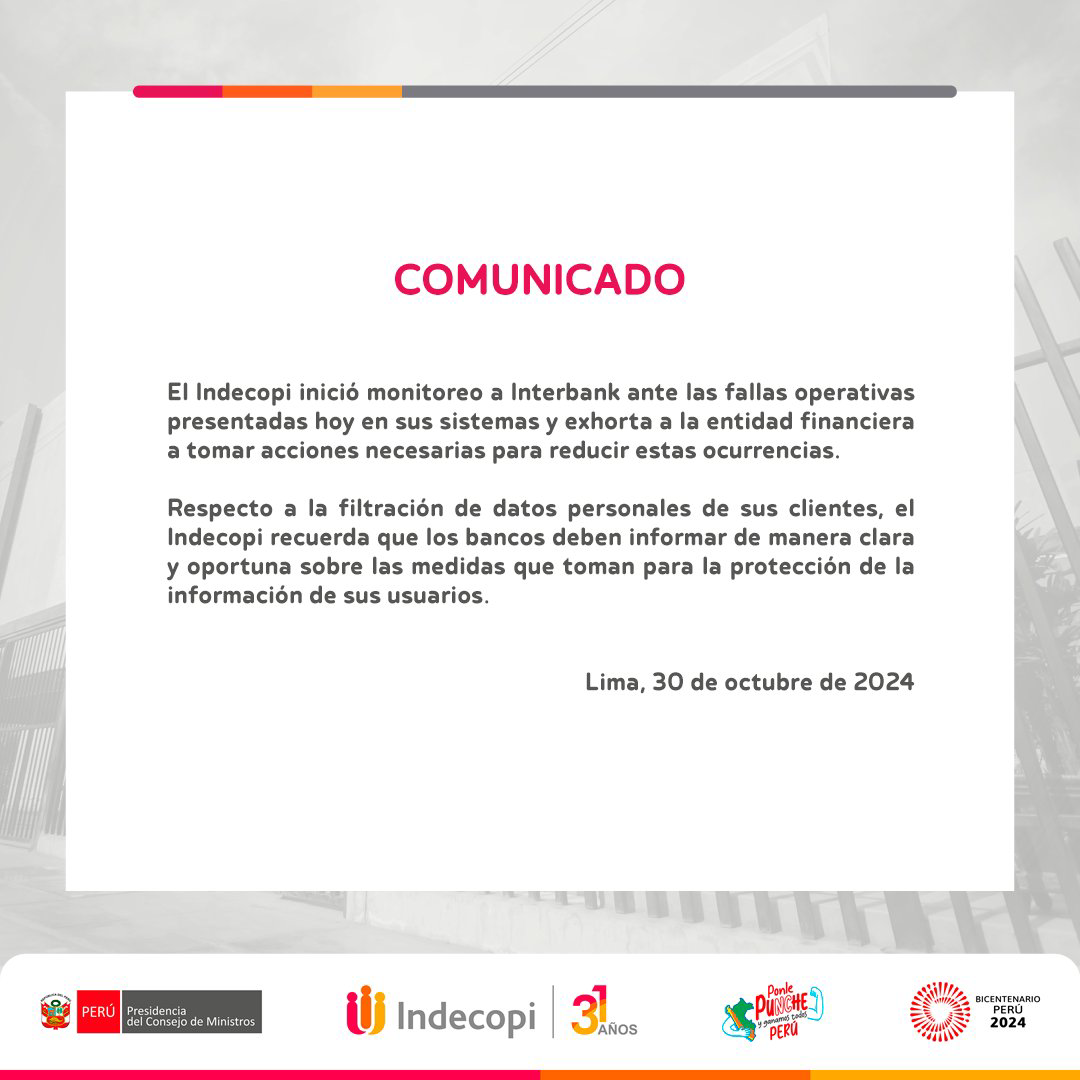 Tras las fallas operativas presentadas este miércoles 30 de octubre por Interbank, el Instituto Nacional de Defensa de la Competencia y de la Protección de la Propiedad Intelectual (Indecopi) inició un monitoreo y exhortó a la entidad financiera a tomar acciones necesarias para reducir estas ocurrencias.